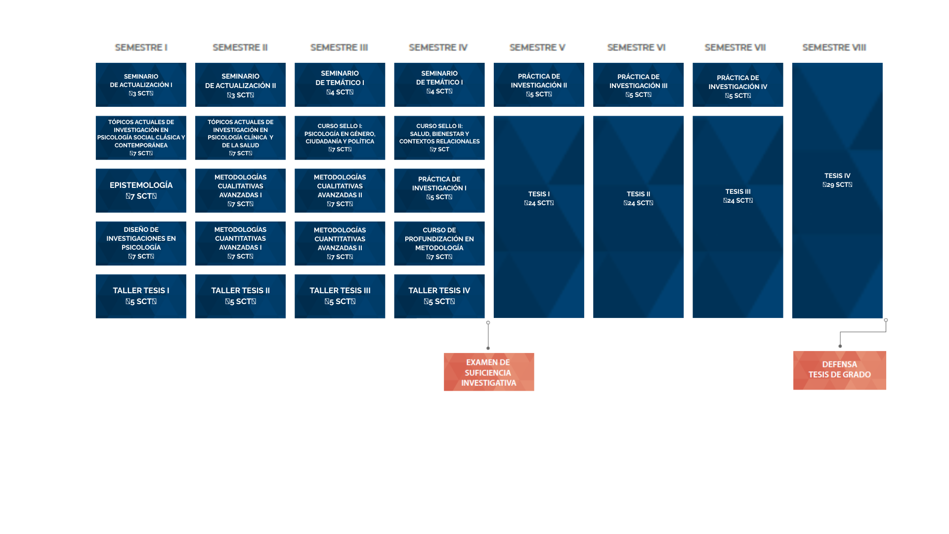 La Estructura Curricular y Plan de Estudios del programa de Doctorado en Psicología UCN-UTA contempla un total de 232 SCT, la realización de 21 cursos obligatorios con un total de 123 SCT, 2 cursos electivos con un total de 8 SCT, y la elaboración de una tesis de grado (tesis I a tesis IV) con un total de 101 SCT. La tesis debe estar adscrita a una de las líneas de investigación del doctorado, incluye un examen oral y es supervisada por un miembro del claustro académico.